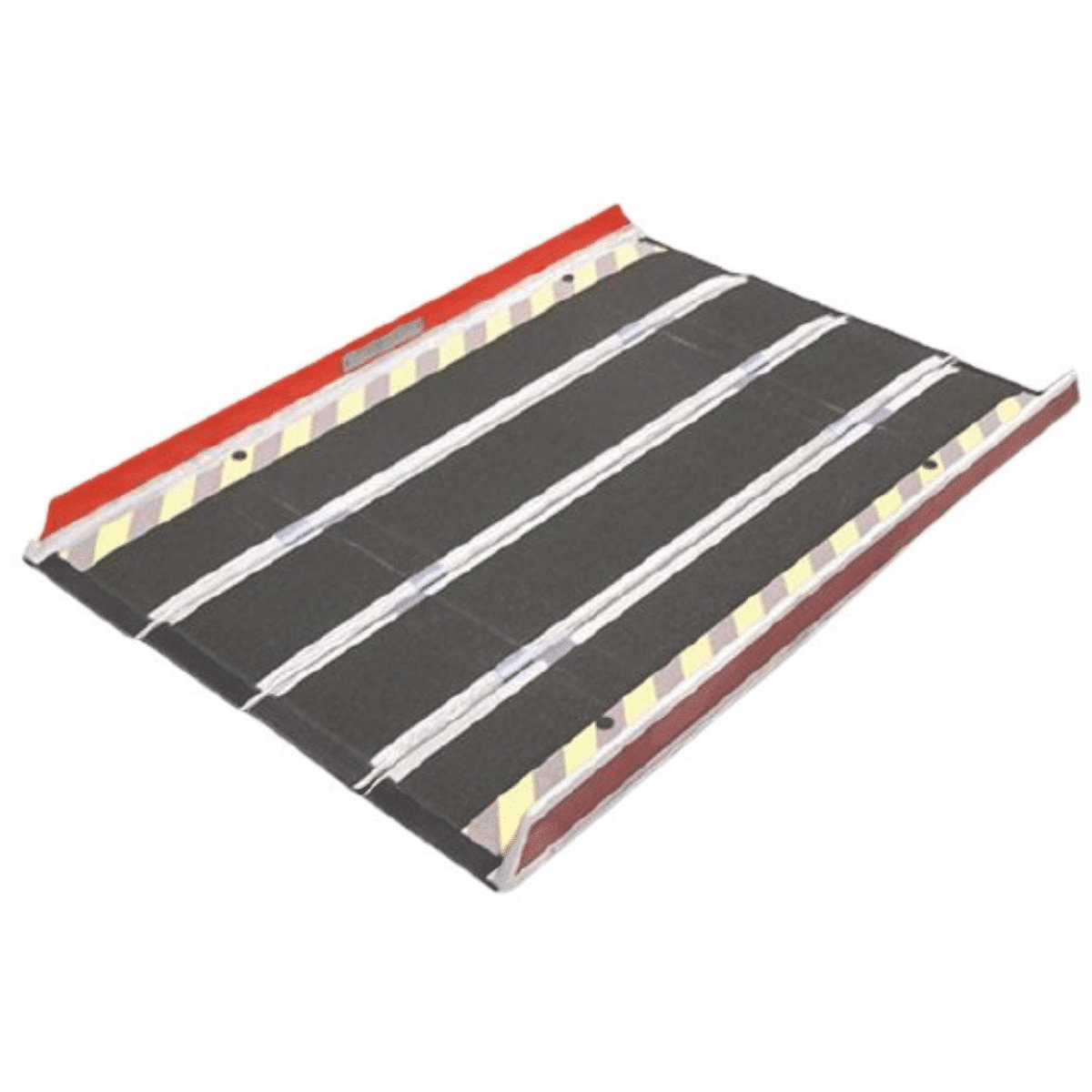 These ramps are made using a combination of uni-directional fibreglass and carbon fibre, giving them strong support while staying light and easy to handle. They're designed to provide reliable access to places like buildings, vehicles, and raised surfaces. A built-in Edge Barrier Limiter (EBL) helps reduce the risk of slipping or falling, which can be especially useful in busy or shared areas. The ramp is built with several panels joined by a special hinge system, allowing it to fold neatly like a concertina. This makes it simple to set up, pack away, and transport. A textured surface and stabilising pads at both ends help keep the ramp steady during use, with no need for extra setup. Key features: